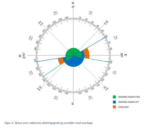 Det ikke blindsoner i radardekningen på Borgland Dolphin. Den fremre (FWD) og aktre (AFT) radaren